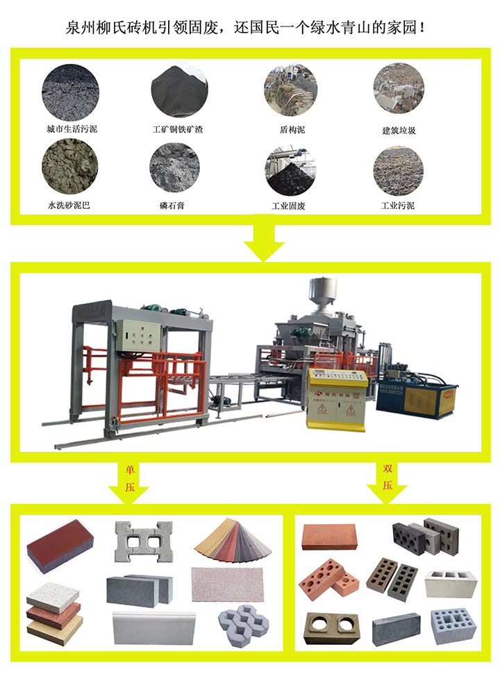 (3)固廢制磚,可以按材料性質(zhì)及配比來選擇不同的機(jī)型。一般含泥量比較高的就采用液壓磚機(jī)來生產(chǎn),含泥量不高的,首先免托板磚機(jī),次之才選擇帶托板的水泥免燒磚機(jī);當(dāng)然了,有制作彩磚、路面磚的還是選擇單壓液壓磚機(jī)會好點(diǎn)!如果猶豫不定選擇什么類型的水泥免燒磚機(jī)的話,可以先咨詢?nèi)萘洗u機(jī)涂先生或者帶上制作原材料,來泉州柳氏磚機(jī)做個試驗(yàn)!
